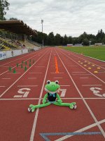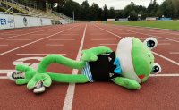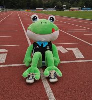 Der leichtathletikbegeisterte Frosch begleitet nun unsere Nachwuchssportler zum Training und zu den Wettkämpfen. Wie man sieht mit viel Spaß und Bewegungsfreude. Er hat schon mal gleich seine Spikes angezogen.